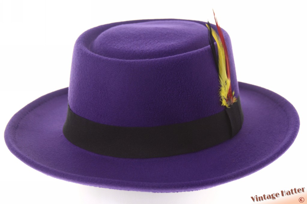 Ronde Gambler hoed diep paars katoen mix met veren 56-58 [nieuw]