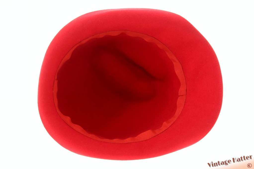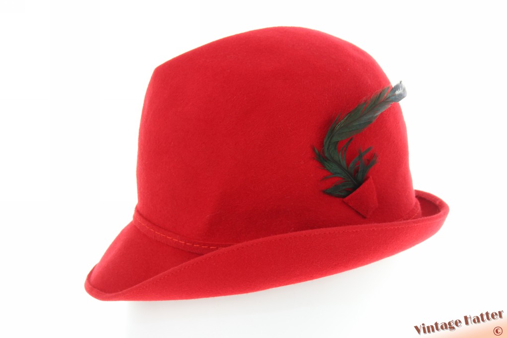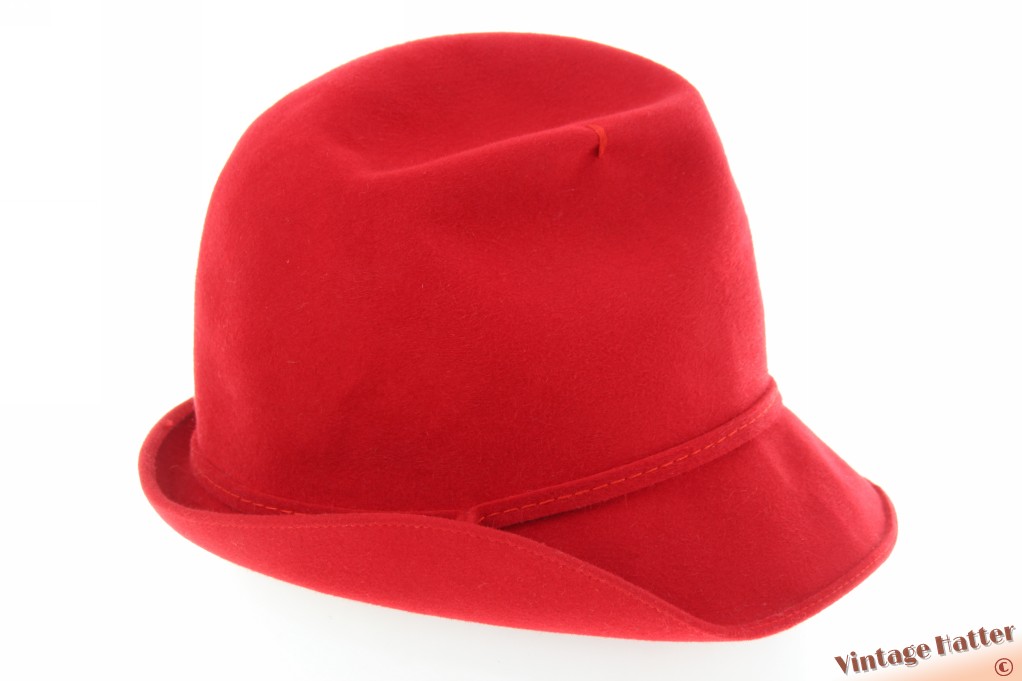 Ladies hat red felt with "pinch" and feather-holder 55,5 (S)