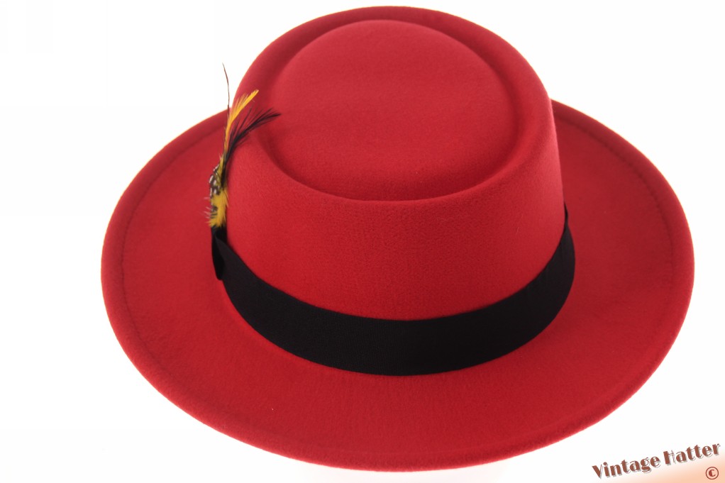 Round gambler hat red cotton mix with feathers 56-58 [new]
